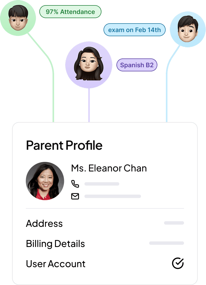 Lesson notes, attendance logs and family billing — centralized in your secure student database.